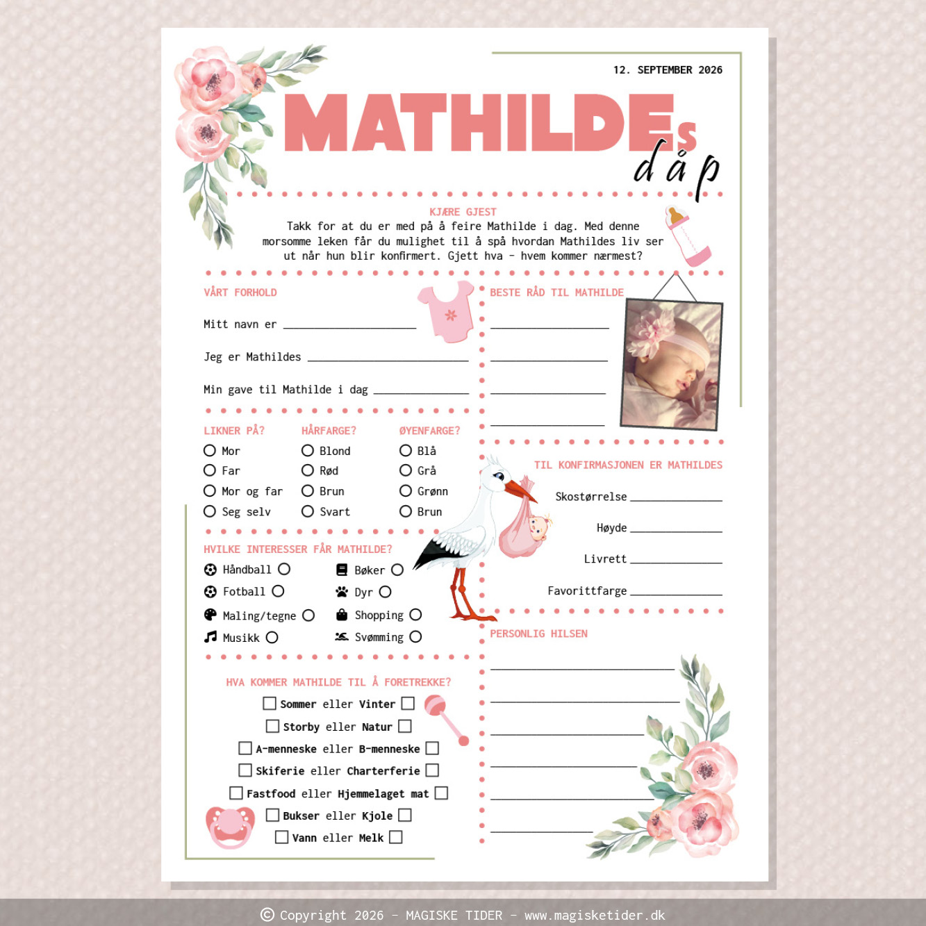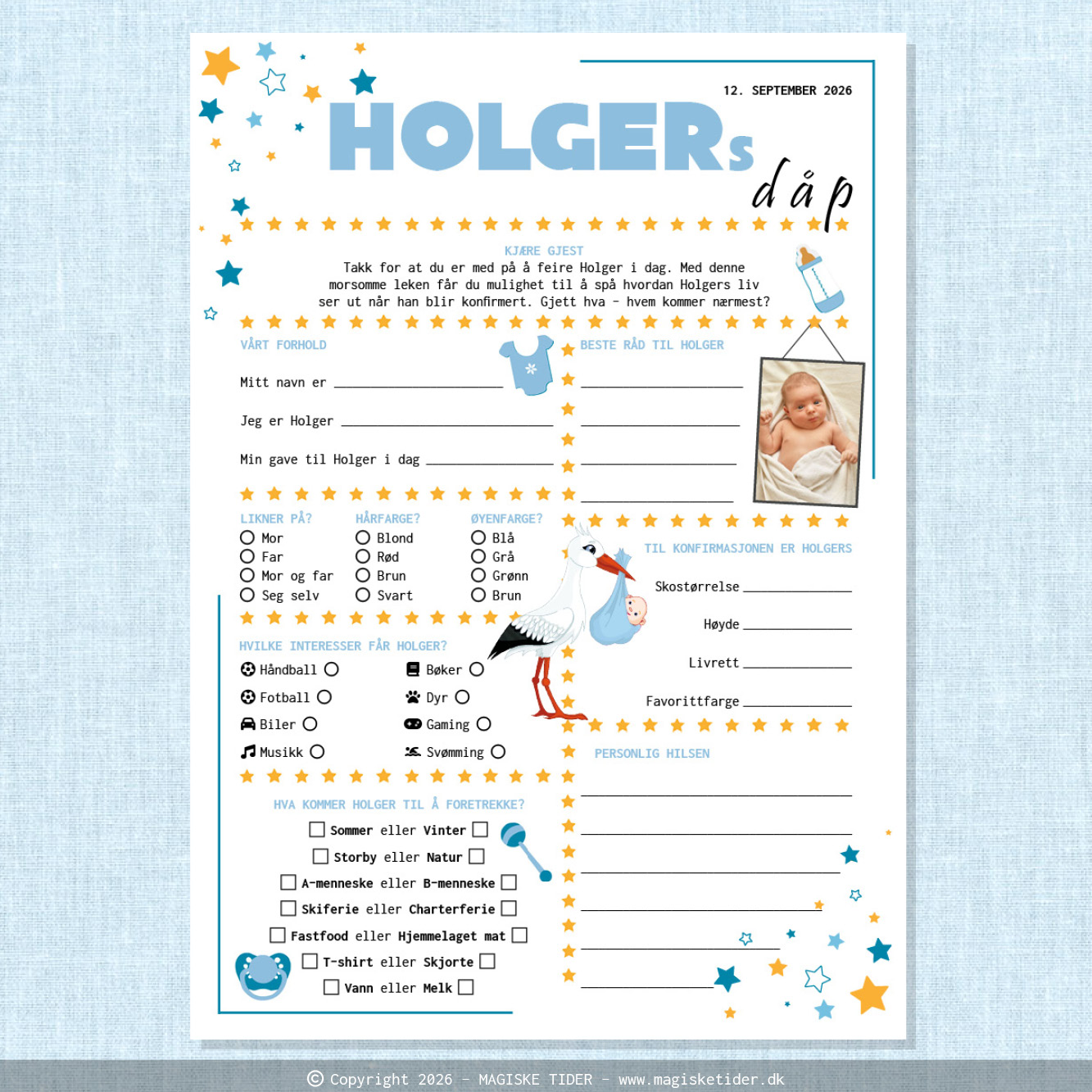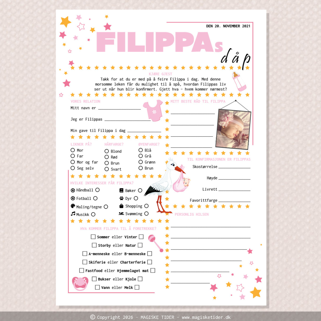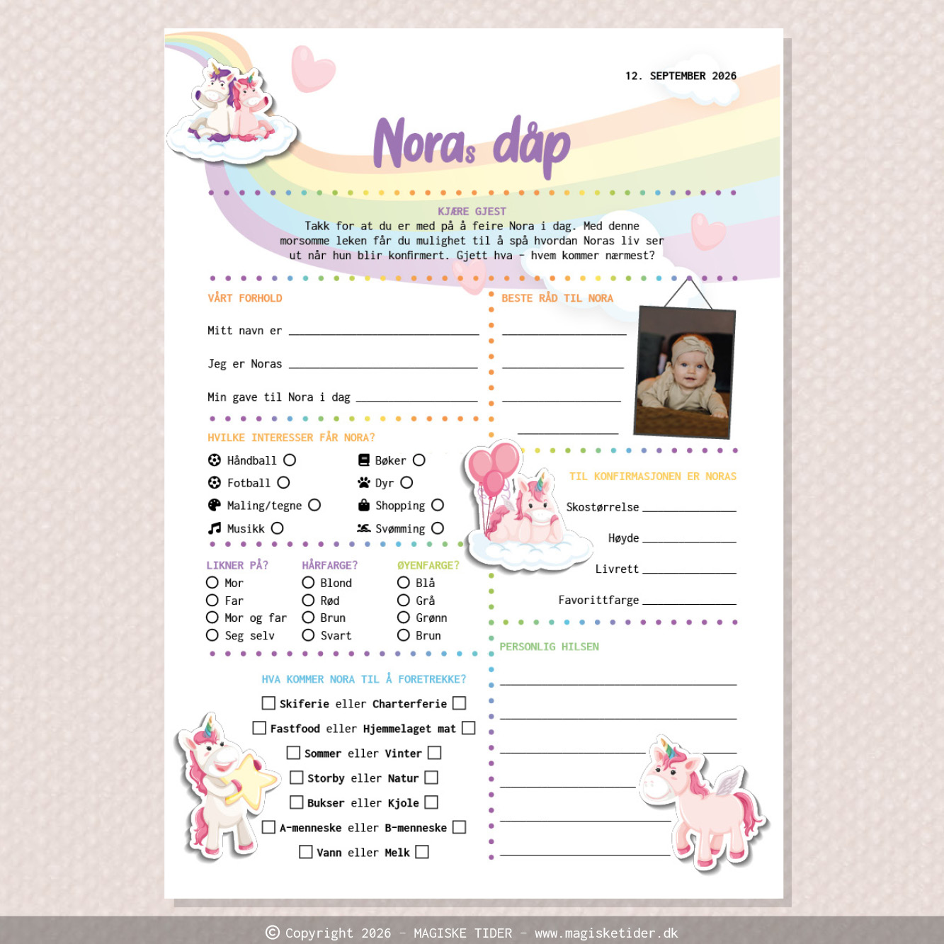 Velkommen til quiz til dåp med norsk tekst hos Magiske Tider. Jeg har opplevd en økende interesse fra norske kunder for våre quizzer, og derfor har jeg oversatt quizene slik at de også fungerer perfekt for dåp og navnefest i Norge 🇳🇴. Designet på quizene er det samme som våre danske versjoner, men teksten leveres på norsk for en bedre opplevelse for norske familier.