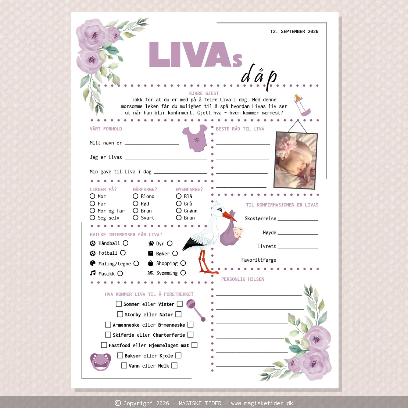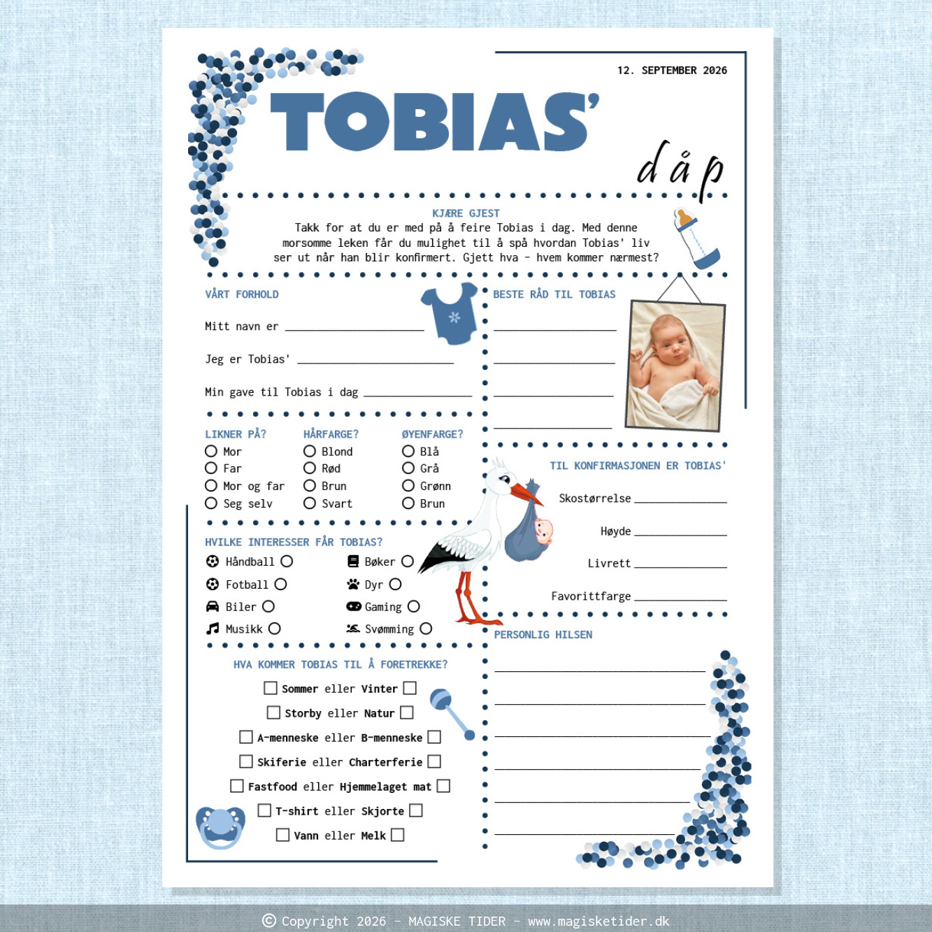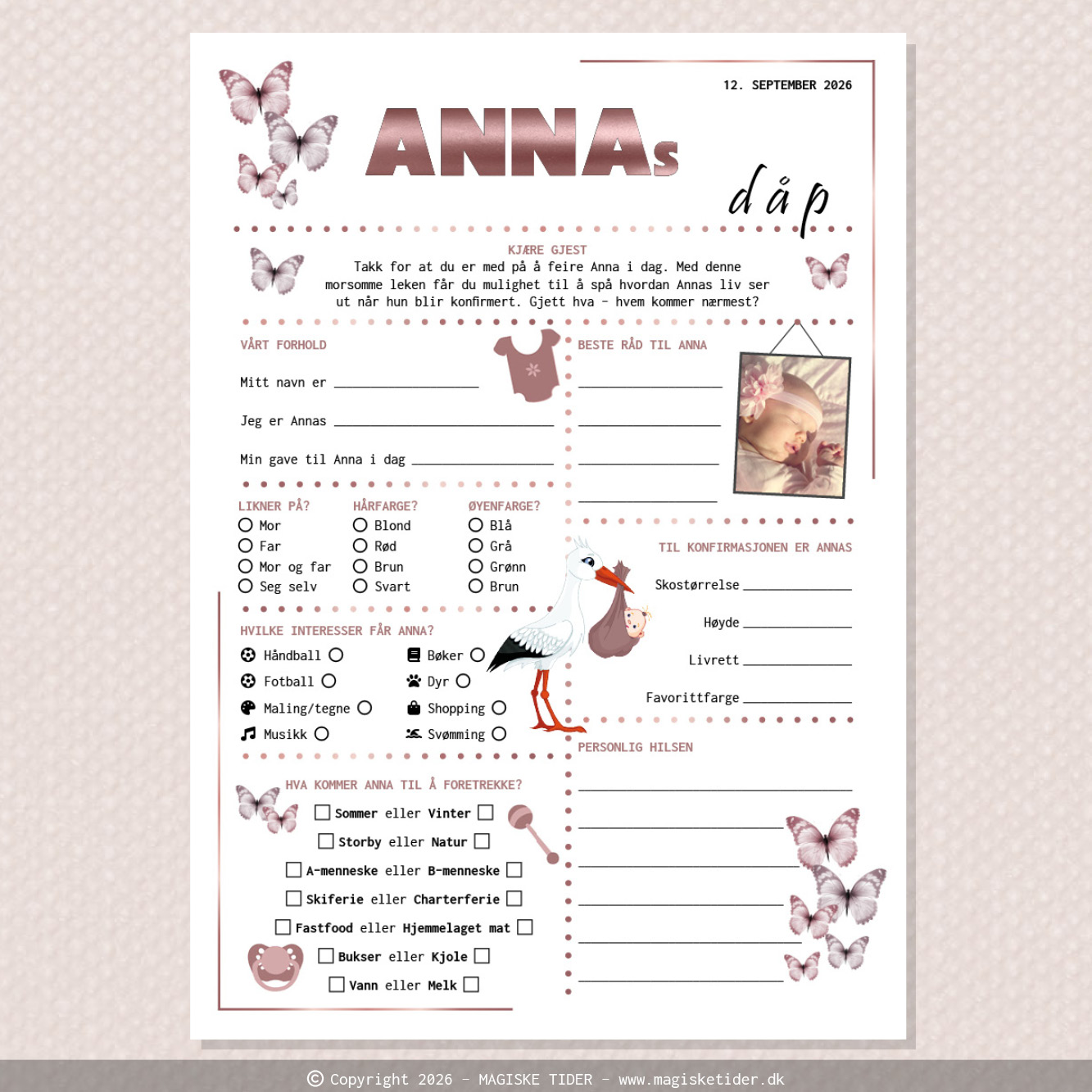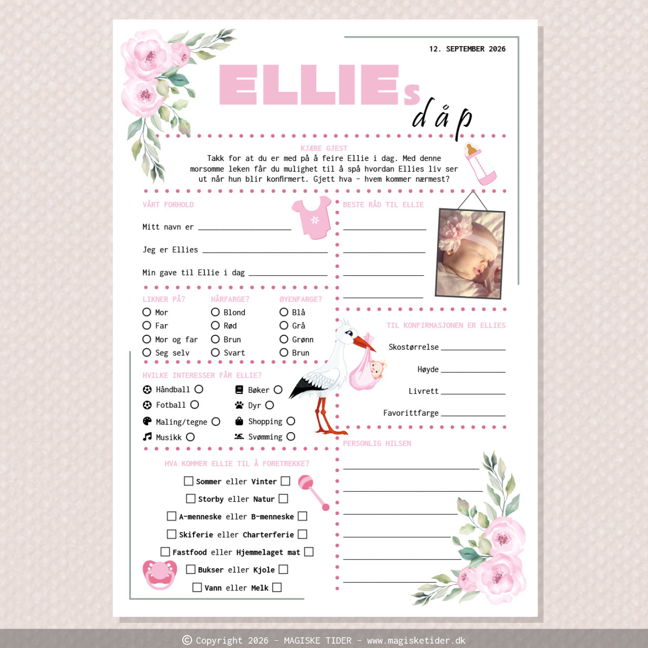 Velkommen til quiz til dåp med norsk tekst hos Magiske Tider. Jeg har opplevd en økende interesse fra norske kunder for våre quizzer, og derfor har jeg oversatt quizene slik at de også fungerer perfekt for dåp og navnefest i Norge 🇳🇴. Designet på quizene er det samme som våre danske versjoner, men teksten leveres på norsk for en bedre opplevelse for norske familier.