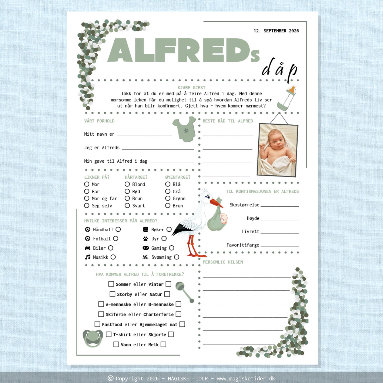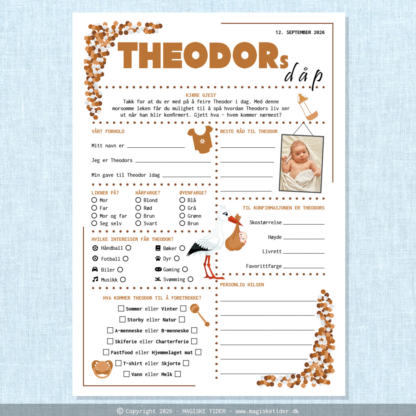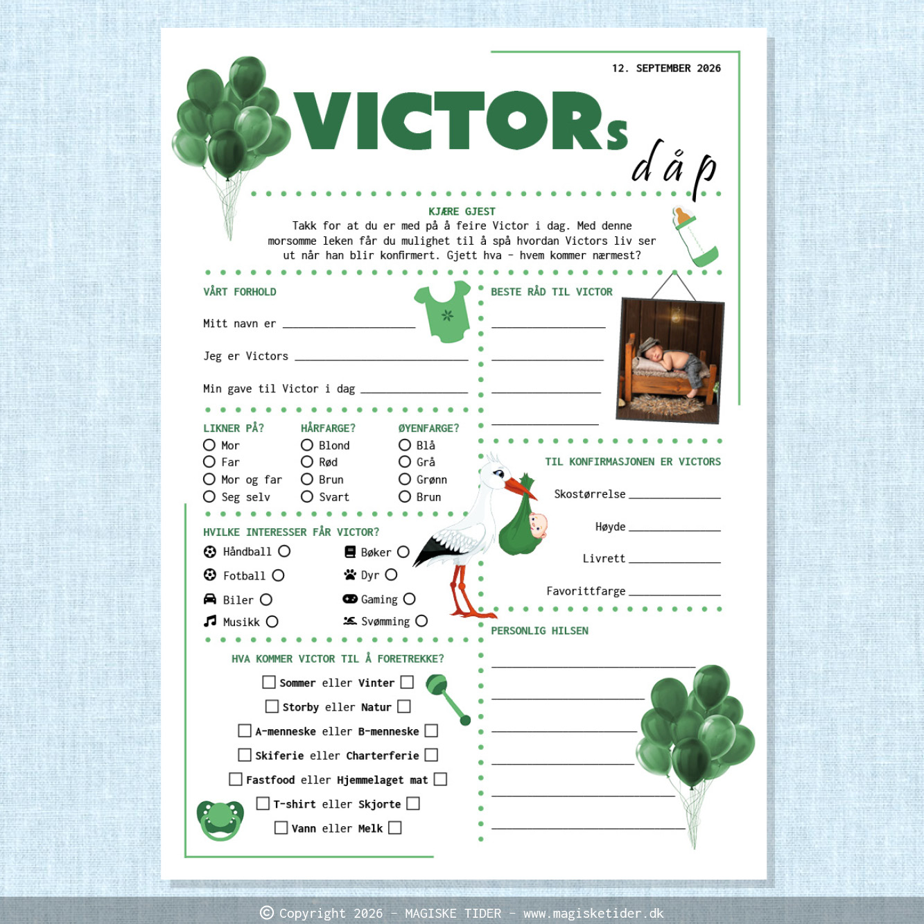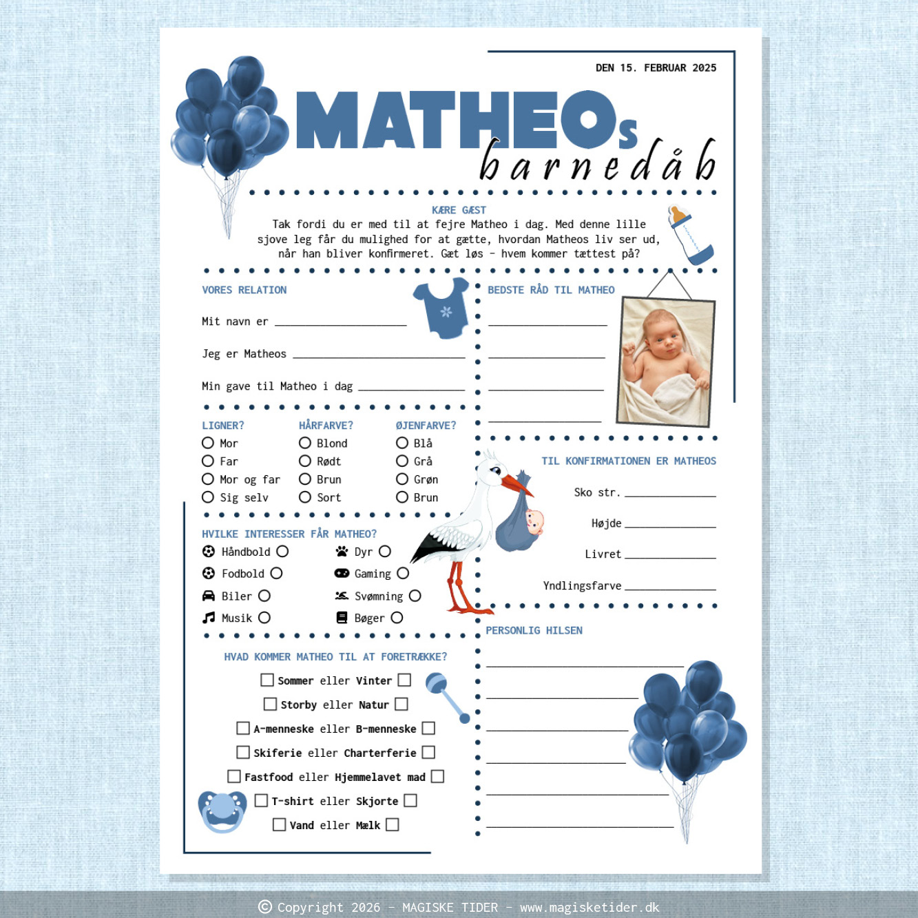 Velkommen til quiz til dåp med norsk tekst hos Magiske Tider. Jeg har opplevd en økende interesse fra norske kunder for våre quizzer, og derfor har jeg oversatt quizene slik at de også fungerer perfekt for dåp og navnefest i Norge 🇳🇴. Designet på quizene er det samme som våre danske versjoner, men teksten leveres på norsk for en bedre opplevelse for norske familier.