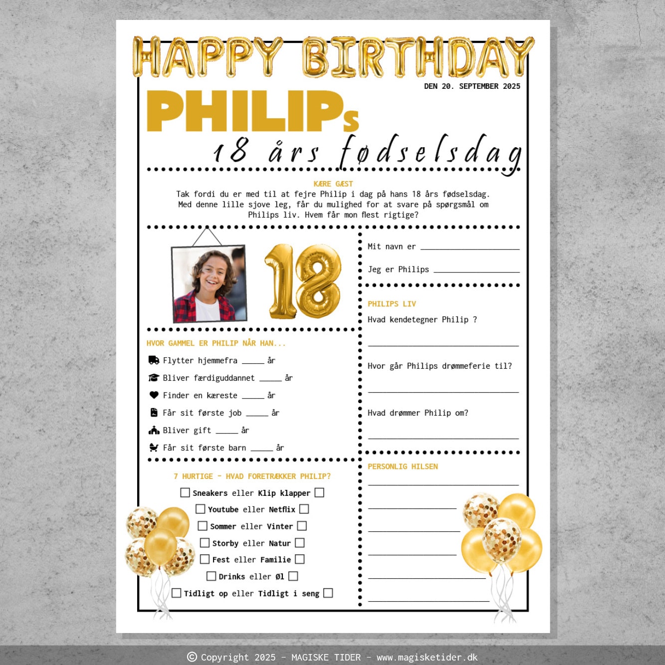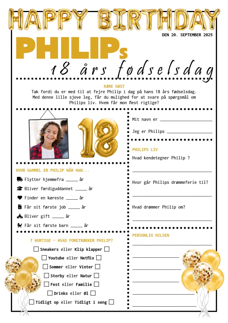 Quiz til 18 års fødselsdag i opsætning i balloner i guld. Quizzen indeholder en række sjove informationer om fødselaren, som gæsterne skal svare på. Svarene kan tages frem ved senere lejlighed og gennemlæses. På denne måde bliver det et sjovt og mindeværdigt minde fra en fantastisk dag.