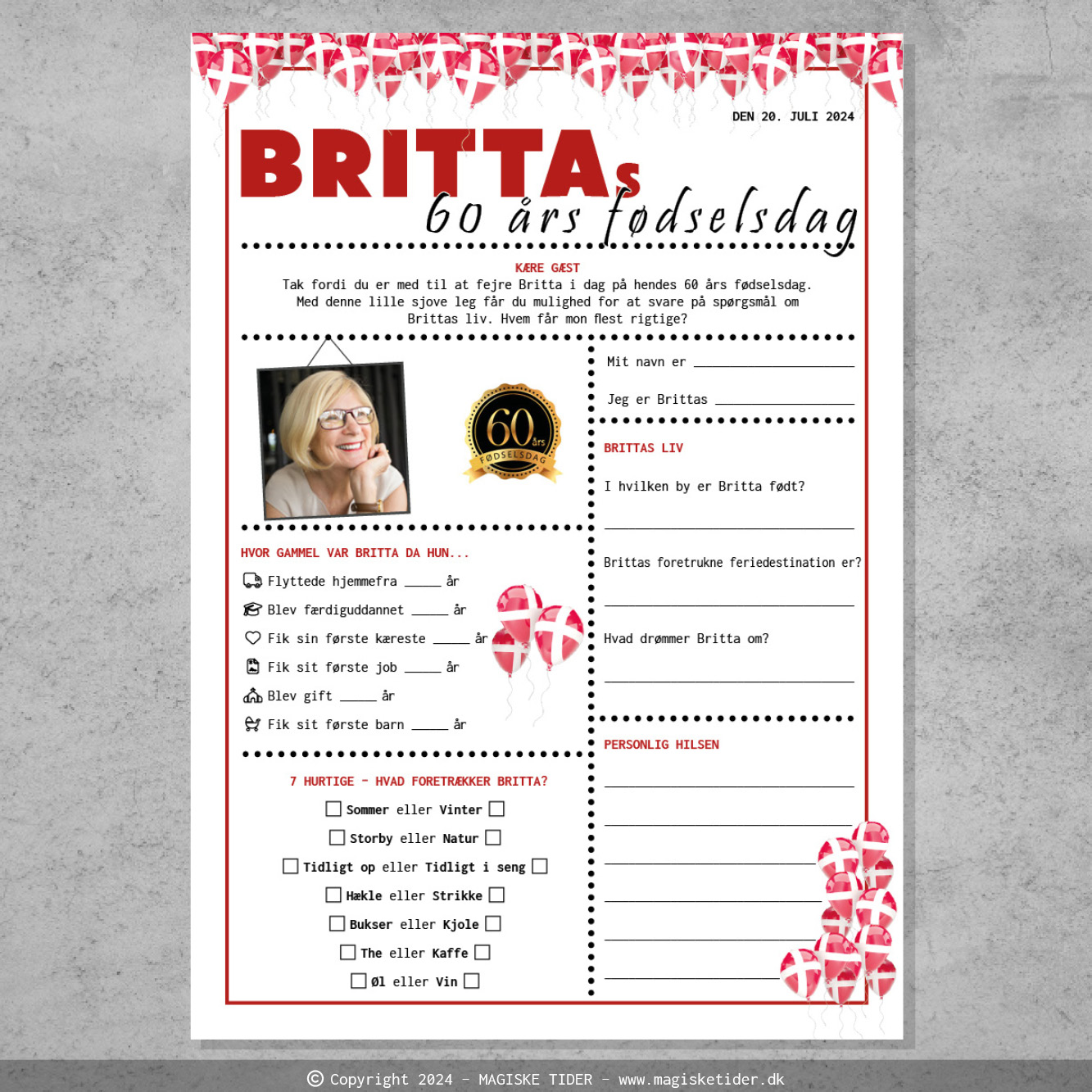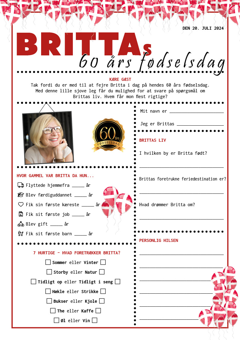 Quiz til 60 års fødselsdag i opsætning i flag og balloner. Quizzen indeholder en række sjove informationer om fødselaren, som gæsterne skal svare på. Svarene kan tages frem ved senere lejlighed og gennemlæses. På denne måde bliver det et sjovt og mindeværdigt minde fra en fantastisk dag.