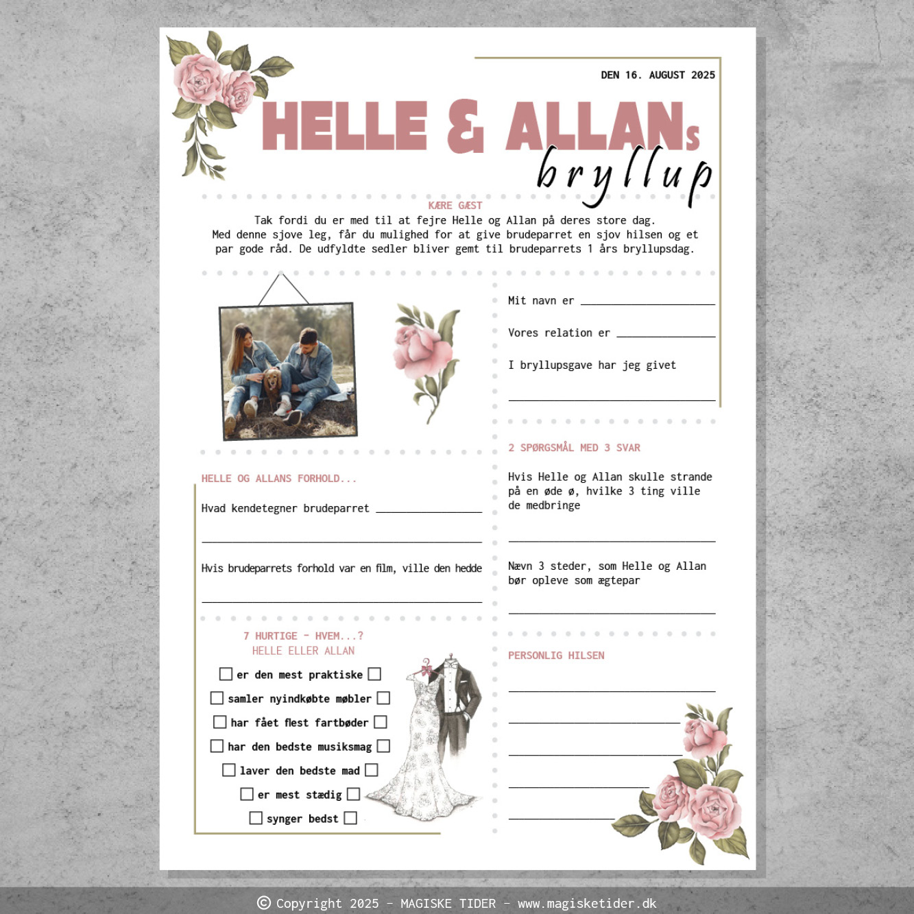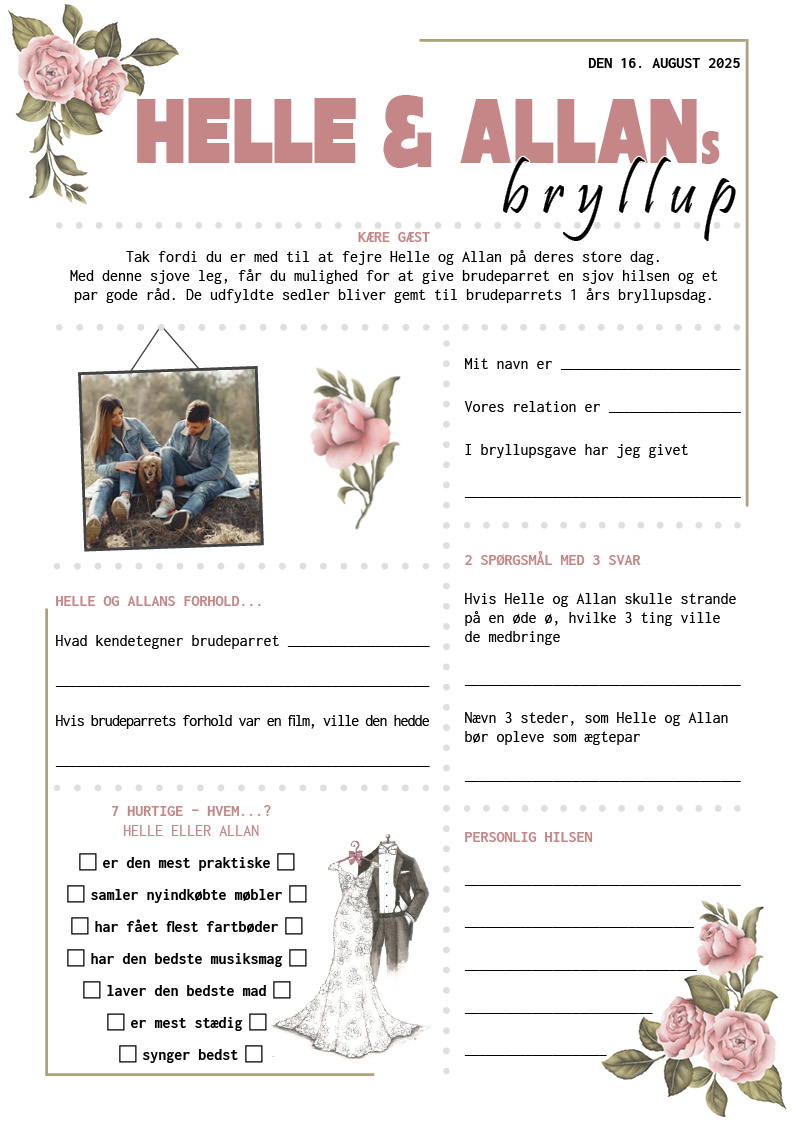 Gør bryllupsdagen ekstra sjov med en personlig quiz om brudeparret! Quizzen er i elegant design med roser og indeholder sjove spørgsmål, som gæsterne kan svare på. Der er også plads til at notere, hvilke gaver man har givet, samt at give gode råd til brudeparret.
