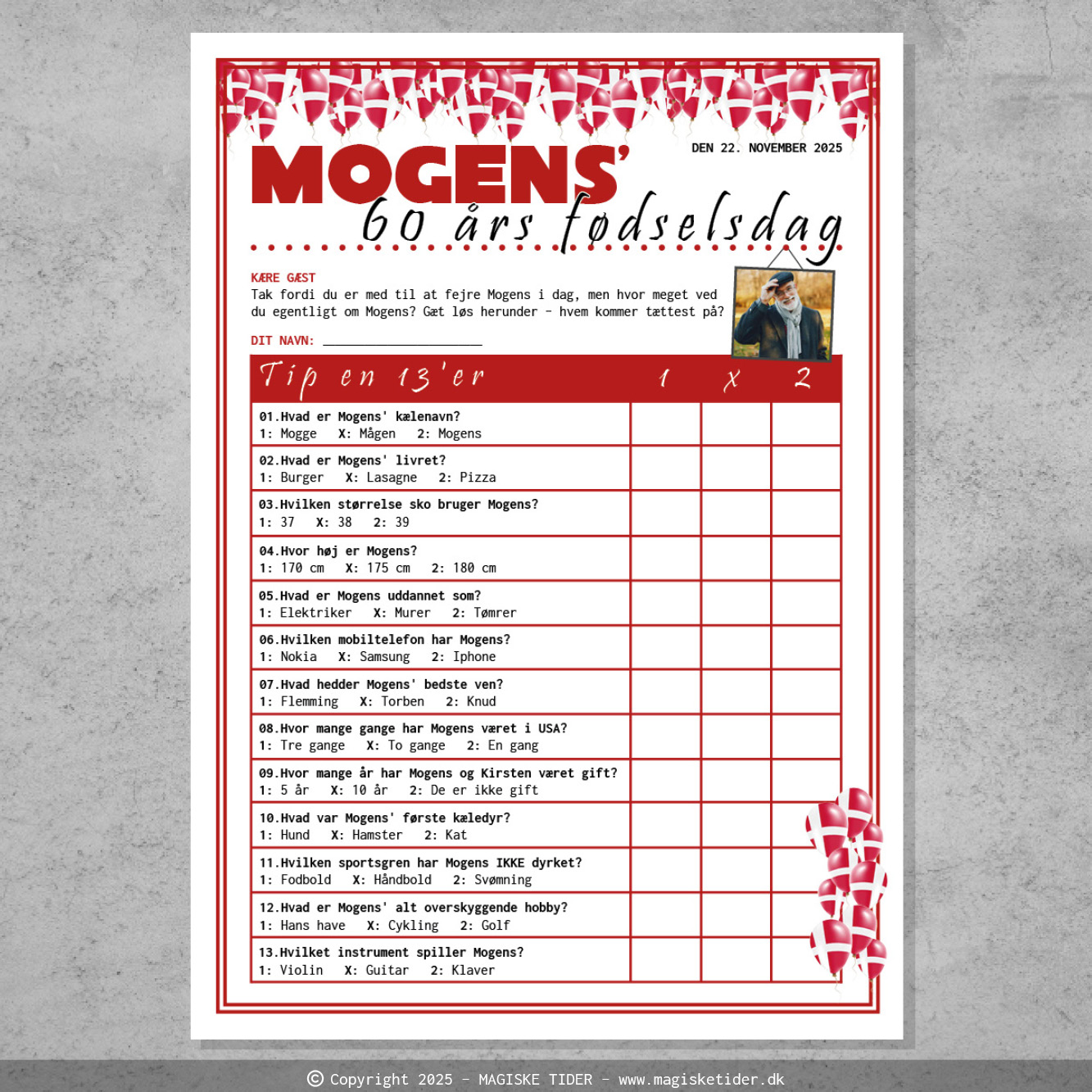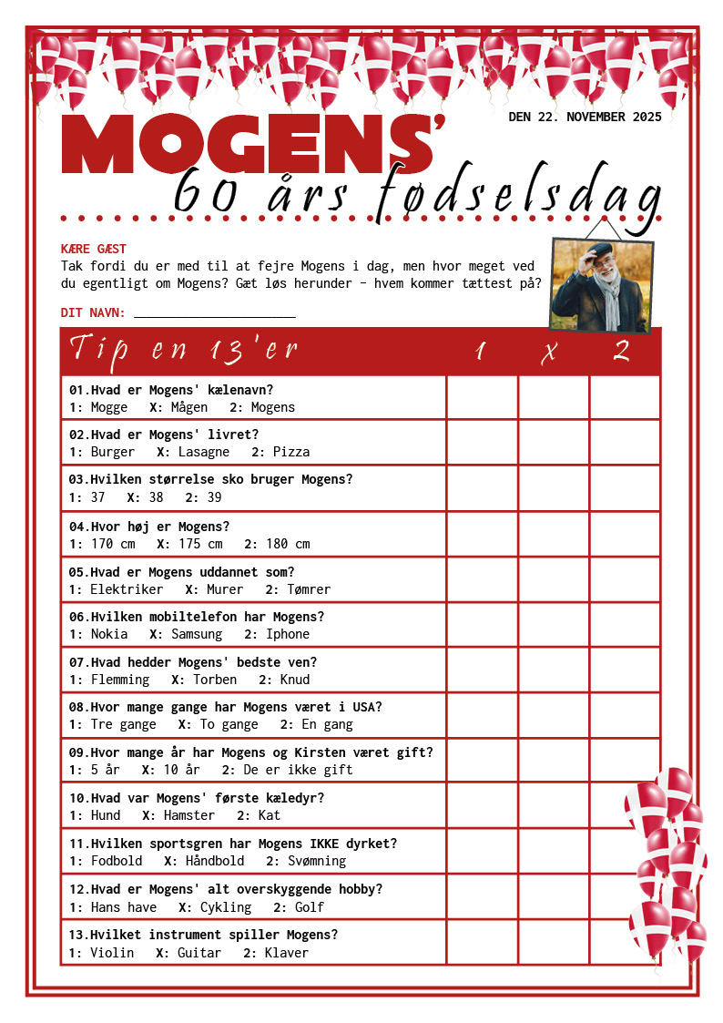 Opsætningen leveres med festligt design i flag og balloner og indeholder 13 spørgsmål, som du selv vælger. Det kan være sjove facts om fødselaren, små konkurrencer eller lige dét, der passer til jeres fest – kun fantasien sætter grænsen ✨